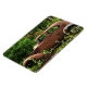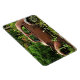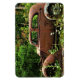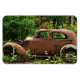 Cet aimant flexible présente une jalopie de junker pauvre laissé à la rouille dans les bois. Il est entouré d'arbres verts et de fleurs sauvages blancs. Cette vieille voiture rouillée orange, brune et bleue possède une certaine beauté et une certaine dignité.