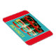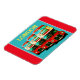 Aimant frigo au design horizontal montrant une photo numériquement traitée de l'ancien style des bus londoniens, dupliqué trois fois sur un arrière - plan de rouge et turquoise. Un grand souvenir de Londres à rapporter ou à mettre dans sa cuisine.