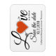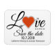 Mariage enregistrer la date magnet fait en blanc avec texte noir lecture L'amour est dans l'air, avec un coeur rouge avec une flèche remplaçant le o en amour. Personnalisez les noms et la date du mariage en fonction de vos besoins. Excellente façon d'annoncer vos nouveautés à l'avance.