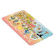 Une scène lumineuse et colorée offre une vue spectaculaire de la Californie du Sud - personnages farfelus sur la plage et le désert de SoCal présentant les parcs de Los Angeles, Orange County, San Diego, Père Noël Barbara, Riverside, Palm Springs, El Centro, Salton Sea, Anza Borrego et Joshua Tree ainsi que les villes frontalières de Tijuana, Tecate et Mexicali. Cette charmante scène a tout - un surfeur pend dix tandis qu'un orque saute de l'eau, des animaux de zoo accueillent les touristes, les amateurs de vin font un toast comme un randonneur est remarqué par un OVNI et bien plus encore...