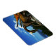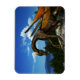 Un dragon s'installe sur un grand rocher, surplombant une forêt de pins, en direction d'un lac.