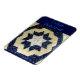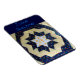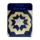 Motif "Star flower" jaune, blanc et bleu foncé. L'"étoile" centrale est blanche avec des canards jaunes foncés. Elle est entourée de "pétales" de bleu foncé avec des fleurs rouges, bleues et jaunes. Une deuxième rangée de pétales est jaune et blanc en vichy chèque, suivi par le motif bleu à nouveau, avec les coins dans le en vichy jaune. Texte en haut : "I Love Quilting"