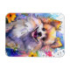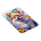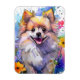 Une image art numérique d'un chien poméranien gai est représentée avec une vive éclat de couleurs dans l'arrière - plan, entourée de fleurs vives et fleuries. L'oeuvre capture l'expression ludique et joyeuse de l'animal.