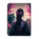Création informatique d'une geisha dans une forêt de cerisiers en fleurs. Image d'une femme avec une jolie robe et des fleurs dans les cheveux portant un kimono. Le design japonais à la mode AI. En arrière-plan, deux bâtiments japonais.