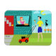 Bienvenue à Suburbia ! Ce Retro Saturday Morning Flexi Magnet propose un beau couple de dessins animés minimalistes dans leur petit coin de paradis. De la fenêtre d'une maison en briques turquoise et turquoise, nous pouvons voir Mme Homemaker. La belle rousse porte une grenouille rose chaude. Elle tient un pichet de limonade fraîchement pressée dans une main. Sur le rebord de la fenêtre devant elle, il y a un tuyau chaud, fait maison, recouvert de treillis, tarte aux fruits dans une assiette de tarte verte. Sur l'allée, devant la porte rouge de la maison, le journal roulé samedi matin attend d'être lu. M. Man de la Chambre est debout sur la pelouse verdoyante. Il porte un short bleu et une chemise jaune qui correspond à la disposition ensoleillée de sa femme. Il se tient derrière une tondeuse à gazon rouge. Nous pouvons voir qu'il a déjà tondu une bande d'herbe, mais, à ce stade, il est difficile de dire s'il travaille dur ou à peine. La tonte semble être au point mort alors qu'il profite d'un verre de limonade acidulé. Ah, rafraîchissant ! A côté de la maison, le félin de famille est perché sur une clôture blanche pour piqueter. Le Snowball, le chat noir nommé de façon ironique, méprise ses fidèles sujets et les fleurs orange et jaune qui bordent la rangée de clôture. Le soleil jaune regarde derrière des nuages bleu clair et moelleux. Le ciel est l'ombre de l'aqua réservé à Hometown, États-Unis dans kitschy, oeuvre d'art moderne du milieu du siècle.