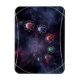 Eine Illustration der Unendlichkeit, das Überqueren des Universums, um das Mikroskop und das Teleskop in einer Regenbogendarstellung von Formen und Farben zu kombinieren. Eine Kolumne mehrfarbiger Atome aus Blau, Rosa, Rot und Grün, umgeben von silbernen Ringen, die sich vor dem Hintergrund farbenfroher Fraktal-Galaxien über den Weltraum spiralförmig bewegen.