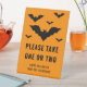 Ein personalisierbares Halloween-Süßigkeitsschild, das sich ideal zum lass von Trick eignet, oder die Wächter wissen, dass sie eine oder zwei Leckereien nehmen können. Das Design ist mit Desteis einfacher Silhouette-Form-Design von fliegenden Fledermäusen in verschiedenen Größen. Die Hintergrundfarbe ist orange. Es gibt auch einen personalisierbaren Textbereich, um glückliches Halloween zusammen mit einem Namen zu wünschen.