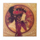 Fliese Alphonse Mucha Donna Orechini. Lithographieanzeige. Alphonse Mucha war ein Magister der Philosophie Nouveau Anzeigen und kommerzielle Plakate. Donna Orechini ist ein auffallendes Profilporträt einer Frau, die einen schwer jeweled Kopfschmuck mit dunklen Rubinen und Goldhalbmonden trägt. Das Haar der Frau ist dunkles Braun und ihre Augen sind ebenfalls Dunkelheit. Sie wird durch die schwere Verzierung umgeben, die von Muchas Arbeit typisch ist. Ein schönes Geschenk für Fans von Kunst Nouveau Plakaten, von Alphonse Mucha und von Vintagen Drucken.