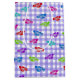Farbenfrohe Flip-Flops auf weißem und lila Gingham-Hintergrund.