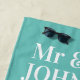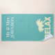 Flitterwochen Strandtücher für Mr. und Mrs. Elegante Geschenkidee für Ehepaare. Aquamarine, blaue oder benutzerdefinierte Hintergrundfarbe mit Palmstruktur-Grafik. Laden Sie optional Ihr eigenes Bild hoch. Erstelle einen für ihn und sie. Ideal für Sommerhochzeiten, Strand, Pool und mehr. Seine und ihre Geschenke für neuen Mann und Ehefrau.