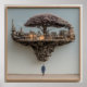 A colossal tree heavy with soft lavender-pink blossoms floats impossibly above a barren desert, its massive root system supporting an entire miniature ruined city of concrete factories, smokestacks, warehouses, and skeletal scaffolding. A lone figure in a blue coat and fedora stands tiny on the cracked ground below, gazing upward in quiet reverence. The scene blends melancholy grandeur, nature’s quiet triumph over decay, human fragility, wonder, and metaphysical mystery—perfect for meditation rooms, moody bedrooms, home offices, therapy spaces, dark-fantasy decor, or as deeply evocative gifts for dreamers, philosophers, surreal-art lovers, spiritual seekers, or anyone drawn to atmospheric depth and impossible beauty.