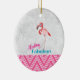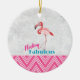 Ein Ornament mit einer grafischen Abbildung eines rosa Flamingos. Text sagt: Flocking Fabulous. Handgezeichnete Zickzack Streifen am Boden.