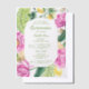 Aquarellblütenpantoletten Tulips Zitronen Quinceañera Vellum Einladungen mit einem Blumenrahmen aus rosa Tulpen, rosa Pfannkuchen, Zitronenzitrus mit Palmblättern und Grün mit goldfarbenen Schimmer Akzenten auf einem weißen Hintergrund. Innen ist Ihre individuelle Quinceañera Einladung Informationen. Personalisieren Sie den Text in den Textfeldern, indem Sie ihn bearbeiten. Für Sie entworfen von Evco Studio www.zazzle.com/store/evcostudio