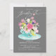 Schönes rosa, lila und weißes Blumenstrauß in einem blauen Teebecher-Set auf grauem Hintergrund für ein Geburtstags-Tee-Party. Dreh unsere Einladung nach hinten, um einen koordinierenden weißen Damast für eine besondere Touch zu sehen.