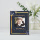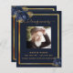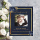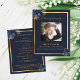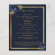 Un programme élégant de 2 pages. Un arrière - plan bleu foncé, un cadre en faux or, des fleurs bleues et un espace pour une photo. Personnalisez et ajoutez le nom, les dates et votre texte.