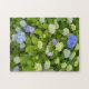 Dieses Puzzle mit Blumenmotiven und blauen Hydrangea-Blume in voller Blüte im Sommergarten. Fotos ©Tim Coffey.