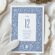 Fügen Sie Ihrer Hochzeitsdekoration eine Touch zeitloser Eleganz hinzu, mit dieser William Morris-inspiriert Tischnummer-Karte. Die Karte mit ihren aufwändigen Blumen- und Weinmustern in klassischem Blau und Weiß verleiht jedem Empfang ein raffiniertes, Vintages Ambiente. Die wunderschön detaillierten Rahmen bilden einen Rahmen für die Tischnummer und schaffen so einen atemberaubenden Brennpunkt für jeden Tisch. Diese Tischnummer-Karte, die sich perfekt für Vintage oder traditionelle Hochzeiten eignet, verbindet geschichtliche Kunst nahtlos mit moderner Funktionalität und macht sie zu einer unvergesslichen Ergänzung Ihrer Hochzeitsdekoration.