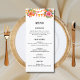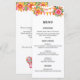 Aménagez l'esprit dynamique de votre journée spéciale avec cette carte de menu Mariage mexicain personnalisée, idéale pour un thème Mariage Fiesta ! Avec ses fleurs rose, orange et jaune vif associées à un drapeau festif et son arrière - plan blanc immaculé, cette carte de menu rayonne de couleurs amusantes et élégantes. Des maracas fleuris roses et oranges, entrecoupés de bleus poussiéreux, apportent une touche ludique mais raffinée. Conçu avec un mélange de polices de caractères traditionnelles mexicaines et fluides, c’est la meilleure façon de célébrer l’amour, la culture et la joie lors de votre fête mariage !