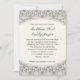 Die klassische Schönheit eines Damast-Musters schafft einen eleganten Rahmen um Ihre Formulierung auf diesem Vintagen Spitzen Blumenstaub. Der Rahmen ist mit einem Perlrücken verziert. Das elegante Design ist hellcremefarben, mit einem grauen Winkeln oder staubigen Lavendelhintergrund. Die Rückseite der Einladung hat auch das Muster. Wenn Sie diesen Platz für weitere Informationen benötigen, können Sie das Muster löschen, um einen soliden Farbhintergrund zu erkennen.