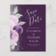 Diese elegante, moderne, Save the Date Postkarte besticht durch ein lila und lavendisches Blumendesign, das mit Imitaten silbernen Glitzer besticht. Der anpassbare Text kombiniert handgeschriebenes Skript und Copperplate-Schriftart in silbergrau auf einem tiefen lila Hintergrund. Die Rückseite wiederholt die Informationen zusammen mit einer anpassbaren Rücksendeadresse.