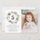 Elégante invitation à fêter l'anniversaire de floraison hivernale mettant en vedette l'âge de l'enfant entouré d'une couronne de fleurs d'ivoire, de baies sèches, de cônes de pins et de feuilles verdoyants. Personnalisez les invitations à la fête d'anniversaire d'hiver en ajoutant le nom de la fille d'anniversaire, la photo et les détails de la fête. L'envers des invitations présente un motif floral hivernal assorti à de belles poinsettias d'aquarelle.
