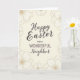 This greeting card features a seasonal message centered on a creamy beige background, setting a soft springtime scene 🌷. The main line, “Happy Easter,” sits near the top in deep charcoal lettering with smooth, flowing strokes that feel like a warm note between close friends. Beneath it, “FOR A WONDERFUL” appears in all caps, with “WONDERFUL” standing out in a warm taupe tone that reads like an extra-sincere emphasis for a valued neighbor. The word “Neighbor” follows below in matching deep charcoal, returning to the same flowing style and keeping the eye moving gently down the page. Around the text, a thin border of stylized floral outlines forms a quiet frame, like a garden ringed around a shared greeting 🐰. The flowers are drawn in golden-beige linework with slightly richer centers, adding small points of depth without crowding the message. In the corners and along the edges, the floral shapes repeat evenly, creating a tidy frame that encloses the centered wording.