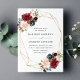 Un élégant faire-part de mariage floral présente vos détails mariages entourés d'un cadre en feuille d'or imitant avec des bouquets de fleurs d'aquarelle bleu marine, bordeaux et rose vif et des feuilles vertes luxuriantes. L'envers des invitations comporte un arrière - plan bleu marine en option.