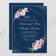 Das elegante Hochzeitsangebot mit wunderschönen rosafarbenen Blume mit Imitaten aus Goldfolie Hexagon und der arabischen Kalligraphie "Bismillah" auf marinebasischem Hintergrund lädt Sie ein. Fügen Sie einfach Ihre Veranstaltungsdetails zu dieser einfach zu bedienenden Vorlage hinzu, um sie zu einer einmaligen Einladung zu machen. Dreh die Karte um ein blau-goldenes Punktmuster auf der Kartenrückseite zu zeigen.
