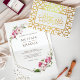 Einladend für Ihre Gäste mit dieser schönen gefalteten Hochzeitseinladung mit einem schönen Blumenrahmen vor einem weißen Hintergrund im Inneren und echte Goldfolie Islamisches geometrisches Muster mit "Bismillah" in arabischer Kalligrafie im Freien. Fügen Sie einfach Ihre Veranstaltungsdetails zu dieser einfach zu bedienenden Vorlage hinzu, um sie zu einer einmaligen Einladung zu machen.