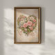 A delicate vintage-style illustration of a heart-shaped arrangement filled with soft pink roses and pastel flowers. The composition is set against a light, textured background with subtle floral patterns, creating a romantic and timeless design inspired by classic shabby chic aesthetics.