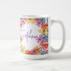 Grande tasse latte à personnaliser pour une femme patron. Des fleurs colorées et illustrées sont imprimées sur une tasse blanche avec le libellé "Boss" et un modèle pour son nom de l'autre côté. Mon propre travail d'art est présenté qui a été fait avec des crayons et des stylos colorés. L'anneau fleuri est mis en miroir et enroule autour de la tasse pour laisser des espaces blancs pour le texte.