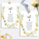 Aidez vos invités à trouver leur table avec cette élégante carte moderne de plan de salon avec les noms des invités. Cartes recto-verso pour que les clients puissent chercher leur nom à l'avant ou à l'arrière. Libérez de l'espace tout autour en vous donnant la liberté d'utiliser des clips ou un trou de perforation pour accrocher des écrans, ou d'utiliser le support/cadre de table. Eléments calligraphiques écrits à la main modernes et belle et délicate couronne florale avec des fleurs dans les tons jaune et blanc. À COMMANDER : veuillez placer et commander individuellement pour chaque table, remplir la carte avec les noms des invités pour la première table, puis ajouter dans votre panier. Revenez et remplissez le deuxième numéro de table et les noms d'invités, ajoutez au panier et répétez jusqu'à ce que toutes vos tables soient terminées, puis passez au paiement. Une partie d'une collection avec une variété de produits de coordination disponibles.