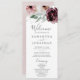Ce programme de mariage romantique à fleurs est parfait pour un mariage élégant. Le design boho rustique moderne présente des fleurs d'aquarelle romantiques dans des tons doux de bordeaux, mauve, rose rousse et blanc crème avec des feuilles verts. Inclure le nom de la mariée et du marié, la date et le lieu du mariage, le message de remerciement, l'ordre de service, la fête de la mariée et un mémorial optionnel "en mémoire d'amour".