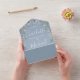 Alles in einer Hochzeitseinladung mit hübschem Grün, Blumenbezeichnungen und schicker Typografie auf staubblauem Hintergrund. Die Einladung enthält eine perforierte RSVP-Karte, die Ihren QR-Code für Ihre Hochzeitswebsite enthält. Entwickelt von Thisisnotme©