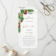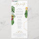 Carte programme mariage au design tropical, feuilles tropicaux, fleurs jaunes et rouges, géométrie or & calligraphie.