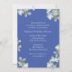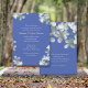 Invitations de renouvellement de voeux chrétiens dans joli périwinkle couleur pourpre-bleu avec fleurs blanches dans les coins et texte personnalisé blanc. Sur le dos figurent un verset ou une écriture biblique spéciale comme "Je connais les plans que j'ai pour vous" qui est l'échantillon.