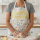 This charming personalized apron features a beautiful, whimsical watercolor pattern of wildflowers and delicate botanical elements in shades of blue, yellow, red, and green, set against a crisp white background. The design is perfected by a prominent horizontal banner across the chest in a soft, cheerful sunshine yellow hue, offering the ideal space for custom text, a name, or a monogram in elegant white script. This stylish and feminine apron is the perfect kitchen accessory or baking gift for home cooks, gardeners, or anyone who loves a touch of spring and nature while they cook, create, or entertain. Its high-quality fabric ensures it is a practical and durable addition to any home, making it a top-selling item for those searching for floral or cottagecore inspired apparel gift.