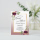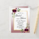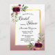 Devant : Un rose à cannelle, arrière - plan à gradient blanc avec un cadre en faux or. Décoré de fleurs bordeaux foncé, de roses, de plumes de style boho et de verdure. Modèles pour le nom de la mariée et les détails du parti. Le nom et le texte : Fête des mariées sont écrits avec un script de style écrit à la main, des lettres de couleur noire. Retour : cannelle rose gradient arrière - plan et rose. Conseil : Si vous ne voulez pas qu'il ressemble à une carte postale, cliquez sur customiser, allez à l'arrière et retirez le séparateur et le timbre postal.