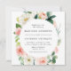 Elégante faire-part de mariage fleurie printanière avec vos noms et détails mariages encadrés par un cercle de fleurs d'aquarelle blanches et rousses et feuilles verts luxuriants. Le faire-part de mariage carré est parfait pour les mariages du printemps et de l'été.