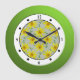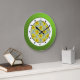 Ein botanischer und heimeliger Stil, in dem das Foto eines gelben Arnica-Wildblumen-Musters den weißen Uhrenkreis mit schwarzen Punkten für alle Stunden bis 3, 6, 9 und 12 erfüllt. Es wird hinzugefügt, was wie ein Kalkgrün gefärbter Rahmen erscheint.
