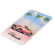 Florida Pink Sunset Reiseplakat mit einem retroamerikanischen Muskelauto gegen einen Sonnenuntergang im Abend.