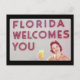 La Floride des années 1950 vous accueille. Une femme tenant un verre de jus d'orange vintage carte postale inspirée.
