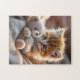 Cute, fluffy red kitten playing with a tiny, soft teddy bear on a cozy, warm blanket. Pretty colors in orange, beige, white. Adorable design for any child!