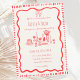 Diese trendige handgezeichnete illustrierte Hochzeitseinladung enthält ein Drehbug- und Abendtischelement. Das skurrile und sonderbare Design beinhaltet handgeschriebenen Schriftart und Festdoodles. Rot und Beije Stil für klassische und moderne Hochzeitsfeste.