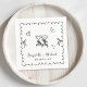 Retro-inspirierte Hochzeitsnapkins für Ihre Verlobungsfeier, Probe Dinner, Empfang und andere Hochzeitsveranstaltungen mit einem trendigen, gewölbten Rahmen, mit Kokettbogen verziert, handgezeichnete Illustrationen einer Herz- und Weingläser und die Namen der Braut und des Bräutigams in einer spielerischen Handschrift.