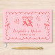 Quirky Retro-inspiriertes hellrosa Hochzeitsgast-Buch mit einem trendigen roten gewellten Rahmen mit Kokettbogen, mit skurrilen handgezeichneten Illustrationen eines Herzens, Sternen und Weingläsern, und den Namen der Braut und des Bräutigams in einem spielerischen roten Drehbuch.