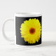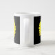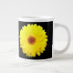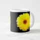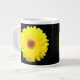 Diese phantastische Tasse ist mit einem Foto einer hübsch fluoreszierenden gelben Blume auf schwarzem Hintergrund ausgestattet.