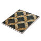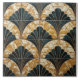 Ein quadratisches Fliesenmuster mit wiederholt sich wiederholendem Halbkreis, wobei jeder Halbkreis in abwechselnde Farbsegmente unterteilt ist: ein tiefes aquamarines und ein motbeltes Gold und Creme. Die aquamarinen Segmente sind solide und glänzend, während die Segmente Gold und Creme ein strukturiertes, fast bedrücktes Aussehen aufweisen. Dünne, dunkle Linien strahlen von der Mitte jedes Halbkreises aus, trennen die Segmente und fügen ein Gefühl der Tiefe hinzu. Die Fliesen sind in einem Gitter angeordnet, wodurch ein zusammenhängendes und symmetrisches Muster entsteht. Der Gesamtstil erinnert an Art-Déco-Designs mit einer modernen, etwas verwitterten Drehung.