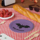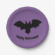 Flying bat on purple paper plate. Happy Halloween!