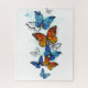 Fliegender, heller, blauer Schmetterlingsmorpho und orangefarbener Monarchschmetterling auf weißem Hintergrund. Morpho. Monarchfalter. Design mit Schmetterlingen.